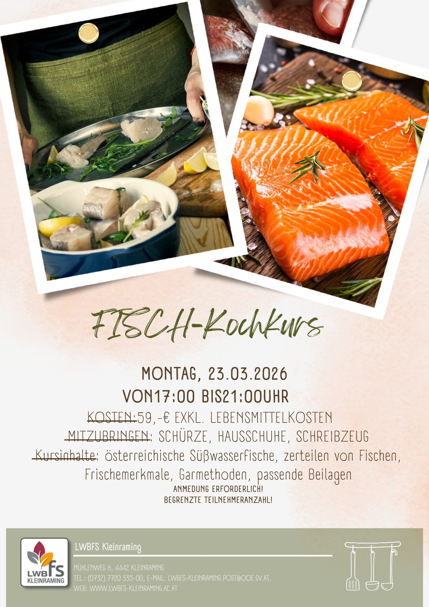 Kursinhalte: österreichische Süßwasserfische, zerteilen von Fischen, Frischemerkmale, Garmethoden, passende Beilagen