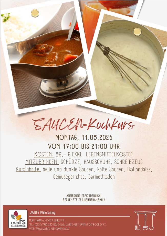Kursinhalte: helle und dunkle Saucen, kalte Saucen, Hollandaise, Gemüsegerichte, Garmethode