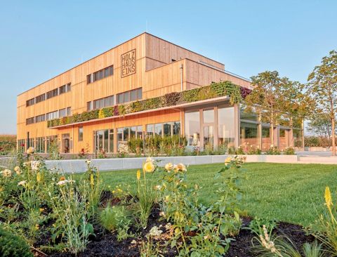 Das Holzhaus E1NS direkt gegenüber von Werk 2 bietet mit seinem Hofladen und Restaurant eine Plattform für den Direktvertrieb von regionalen Produkten. Dank eines Essenszuschusses von 3,5 Euro seitens AGRU können wir dort verbilligt zu Mittag essen.