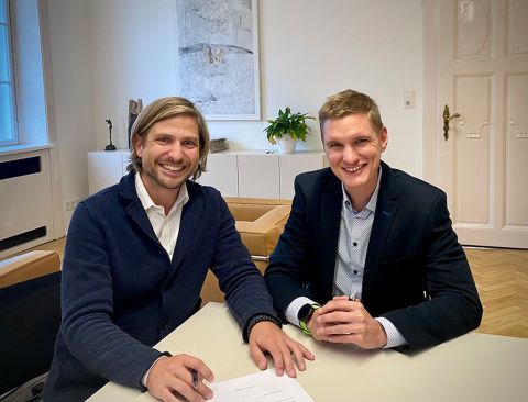Die Geschäftsführer Martin Hartl, links, und Andreas Rosensteiner bei der Unterzeichnung des Kaufvertrages für das neue Grundstück